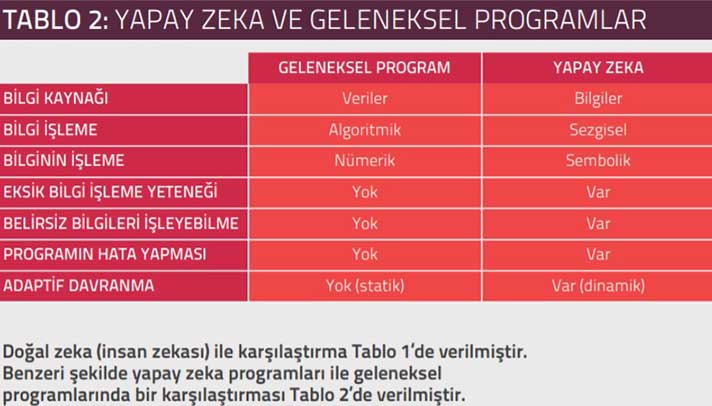 Doğal olarak bu davranışları sergileyebilmek için sadece Bilgisayar Bilimi teknikleri yeterli değildir. Aynı zamanda Matematik, Psikoloji, Biyoloji ve Felsefe bilimleri ile de ilgilidir. Doğal zeka (insan zekası) ile karşılaştırma Tablo 1’de verilmiştir. Benzeri şekilde yapay zeka programları ile geleneksel programlarında bir karşılaştırması Tablo 2’de verilmiştir.